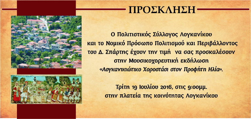 Ο Πολιτιστικός Σύλλογος Λογκανίκου και το Νομικό Πρόσωπο Πολιτισμού και Περιβάλλοντος του Δήμου Σπάρτης έχουν την τιμή να σας προσκαλέσουν στην Μουσικοχορευτική εκδήλωση «Λογκανικιώτικο Χοροστάσι στον Προφήτη Ηλία».