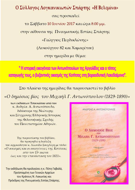 «Η ιστορική οικογένεια των Αντωνόπουλων της Αργολίδος και ο τόπος καταγωγής τους, ο βυζαντινό οικισμός της Κοτίτσας στην Βορειοδυτική Λακεδαίμονα».