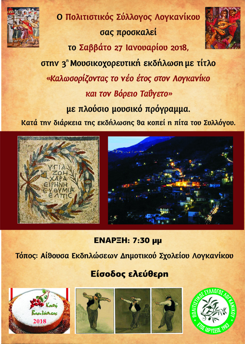 Ο Πολιτιστικός Σύλλογος Λογκανίκου σας προσκαλεί το Σαββάτο 27 Ιανουαρίου 2018, στις 7:30 μμ. στην Αίθουσα Εκδηλώσεων του Δημοτικού Σχολείου Λογκανίκου, στην 3η Μουσικοχορευτική εκδήλωση με τίτλο «Καλωσορίζοντας το νέο έτος στον Λογκανίκο και τον βόρειο Ταύγετο», με πλούσιο μουσικό πρόγραμμα.